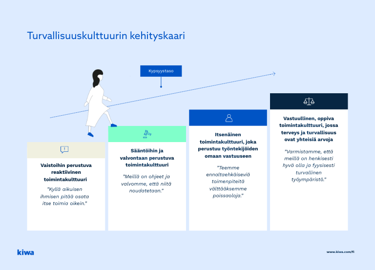 Turvallisuuskulttuuri vahvistuu vaiheittain hyvä johtamisen kautta, kun arjen havainnoista opitaan ja toimintatapoja kehitetään kohti ennakoivaa ja sujuvampaa yhteistyötä. Luottamuksen kasvaessa ja vastuunoton vahvistuessa työyhteisö pystyy toimimaan turvallisesti myös muuttuvissa tilanteissa. Silloinkin, kun kaikkea ei voi ennakoida.