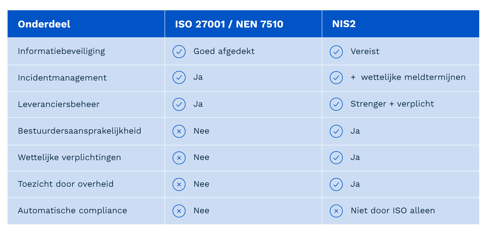 ISO 27001 en/of NEN 7510 certificering helpt enorm, maar organisaties voldoen daarmee niet automatisch aan NIS2. In onderstaand schema ziet u welke aspecten worden afgedekt door ISO 27001/NEN 7510 en welke door NIS2.